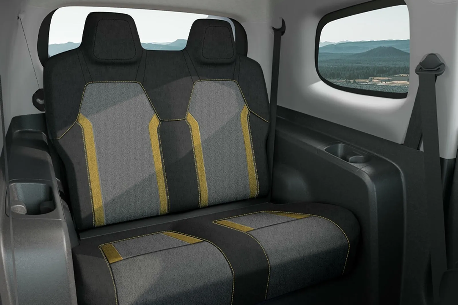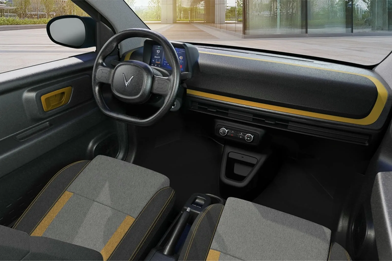 Nội thất tổng thể tông màu xám. Ghế nỉ màu xám với điểm nhấn vàng hoặc xanh. Không gian hàng ghế sau dự kiến sẽ khá hạn chế do kích thước nhỏ gọn, thiết kế hai cửa. Bù lại, chiều cao Minio Green còn nhỉnh hơn VF 3 đôi chút nên có thể dự đoán không gian trần khá thoáng.