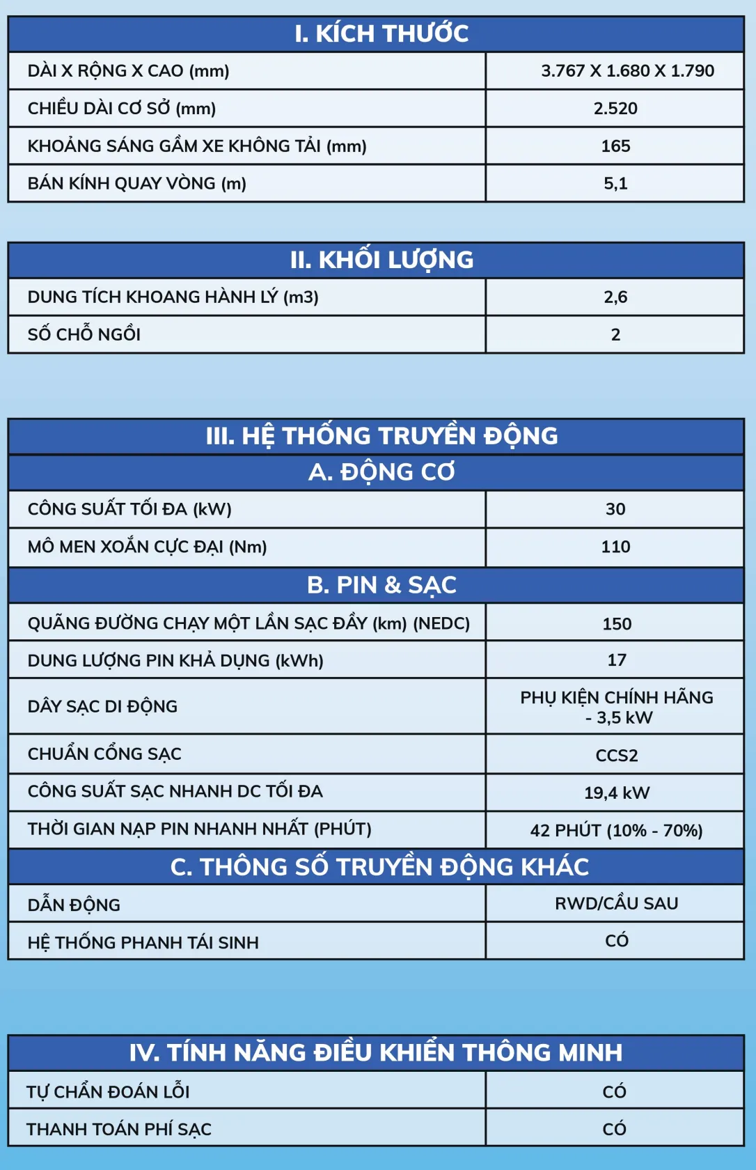 VinFast EC Van được trang bị động cơ điện có công suất tối đa 40 mã lực, mô-men xoắn cực đại 110 Nm - thông số tương đương với VF 3 cùng "nhà". Bộ pin 17 kWh trên xe cho phép di chuyển 150 km sau mỗi lần sạc đầy, tốc độ tối đa 75 km/h.